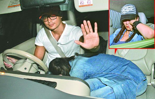 Tavia’s head reportedly was tucked in between Him’s legs and refused to lift up her face. Looking shocked and irritated, Him tried to stop the reporters from taking the pictures. Tavia was snapped covering her face with hands and her face was red, looking very embarrassed.