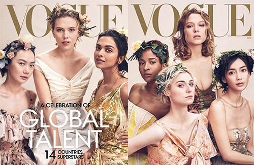 The April edition of Vogue Magazine, which comprises of two different covers featuring a total of seven actresses, focuses on the theme of “global talent.” Other stars covering that month include American actress Scarlett Johansson, Australian actress Elizabeth Debecki, Indian actress Deepika Padukone, French actress Lea Seydoux, and Nigerian actress Adesua Etomi.