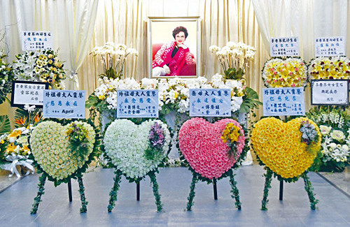 Abiding by the wishes of her family members, no pamphlets were distributed, but photographs of the late actress was put up at the funeral service. Dozens of photos showcased the actress laughing heartily with opera star Bak Sheut Sin (白雪仙), late actor Tam Ping Man (譚炳文), Louis Koo (古天樂), Connie Chan (陳寶珠), Chow Yun Fat (周潤發), Sean Lau (劉青雲), Susanna Kwan (關菊英), Lydia Shum (沈殿霞), Deborah Lee (狄波拉), Barbara Yung (翁美玲), Leslie Cheung (張國榮), Anita Mui (梅艷芳), and Paula Tsui (徐小鳳).