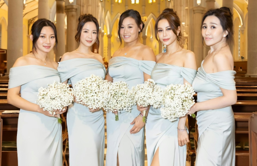 Besides her appearances at daughter Poached Egg’s yearly birthday party, Sabrina’s whereabouts were virtually unknown in the recent 3 years. Playing bridesmaid for a good friend at a recent event, the 33-year-old was dressed in an off-shoulder dress like the rest of the bridesmaid team, and looks to have regained her pre-pregnancy figure – considerably slimmer than four years back when she was bridesmaid for Carmen Yim (嚴紀雯), daughter of Stanley Yim.
