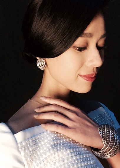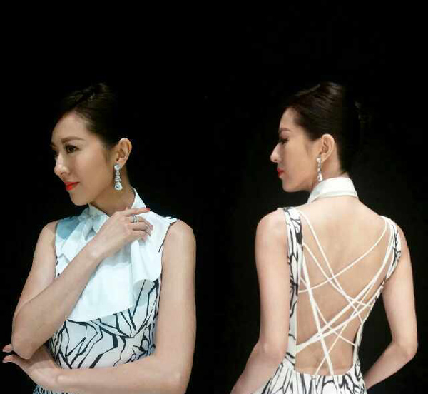Sharon Chan is still in her wedding mindset. Designed by Alex Lam, the layers leading down the train of her dress accentuate her tall and slender frame. As usual, Sharon overdoes it with over-the-top jewelry glamor.