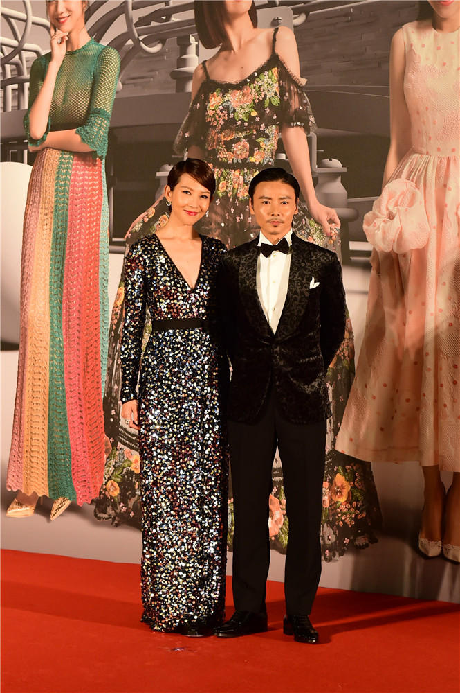 Best Actress nominee Miriam Yeung walked the red carpet with her husband, Real Ting (丁子高). The Little Big Master <五個小孩的校長> actress exuded sophistication and maturity with her modest golden gown that had flared sleeves and lace trimming. Her red lips added more to her regal look.