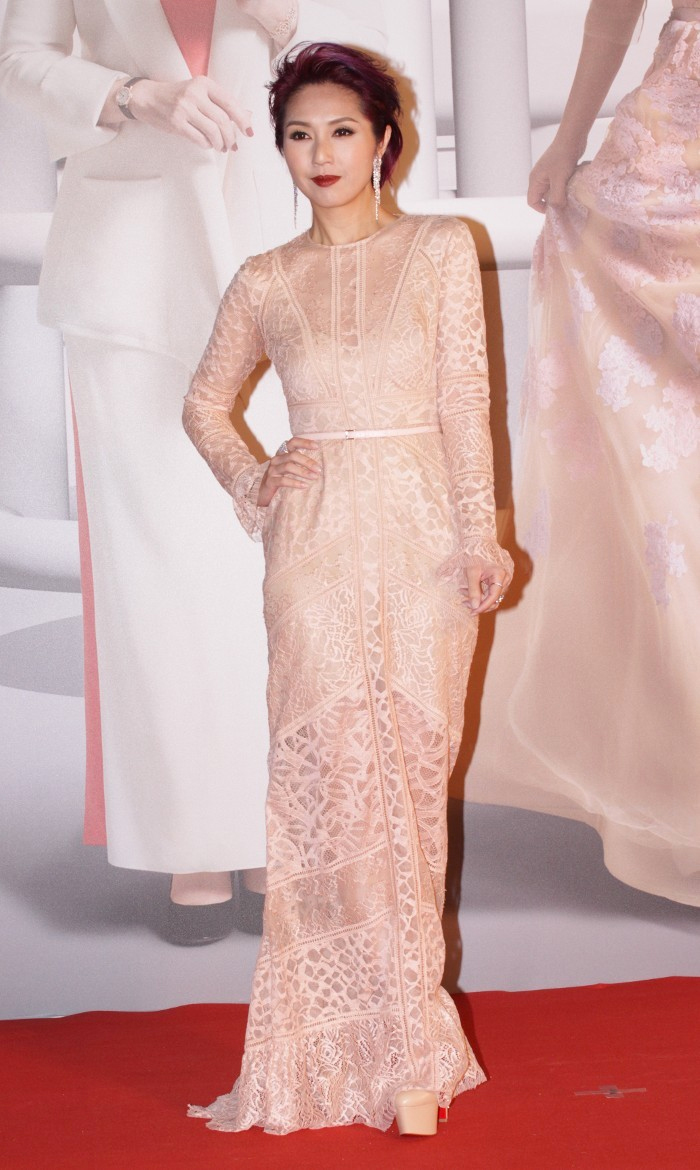Plenty of see-through dresses dominated HKFA’s red carpet, but Fiona Sit’s gown was sheer all the way through, revealing her black bra and nude-colored underpants. Her graceful Burberry dress had a dangerously low deep-V cut and a plunging backline, all which complimented her body shape. The singer was there to present the Best Supporting Actor award.