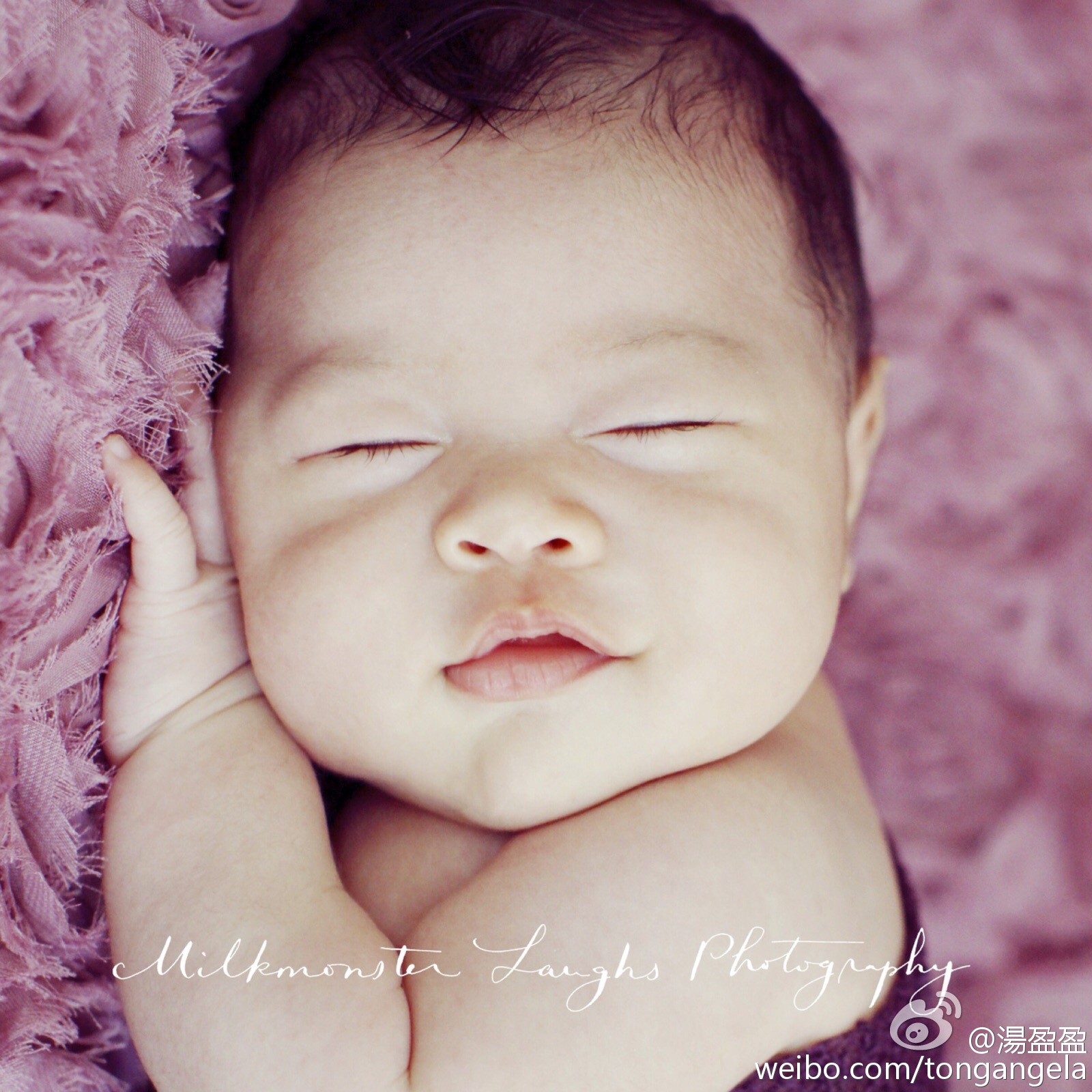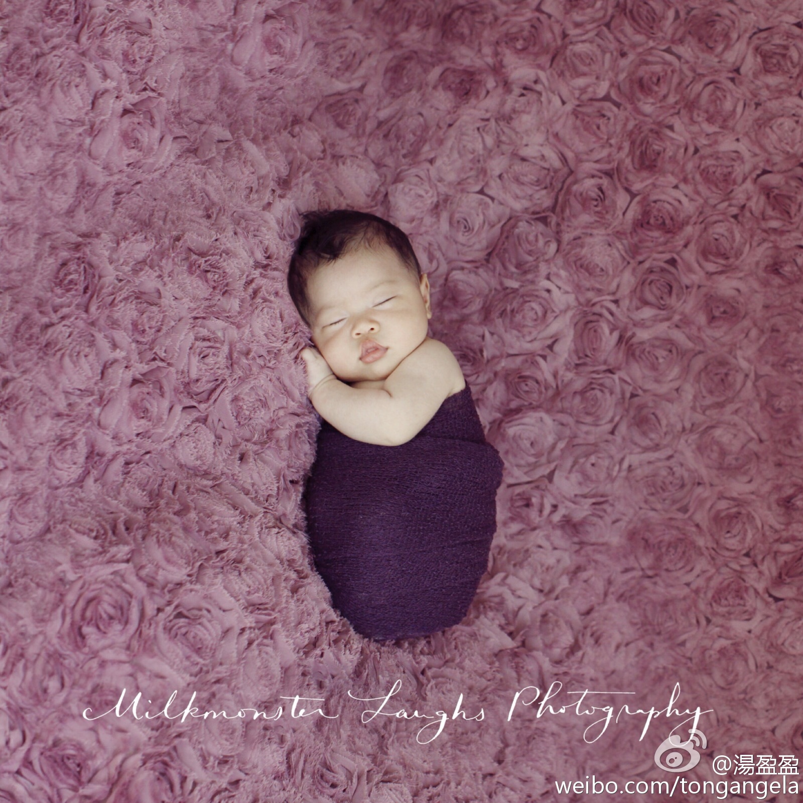 Angela shared a few pictures from the party on her official Weibo account, including a portrait of the family of four. She also included very cute professional photoshoot of Kassidy sleeping on a bed of purple roses.