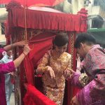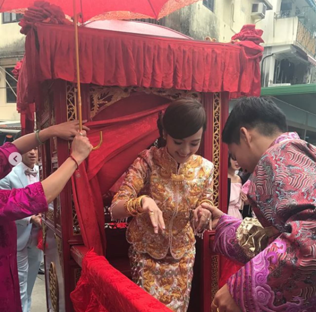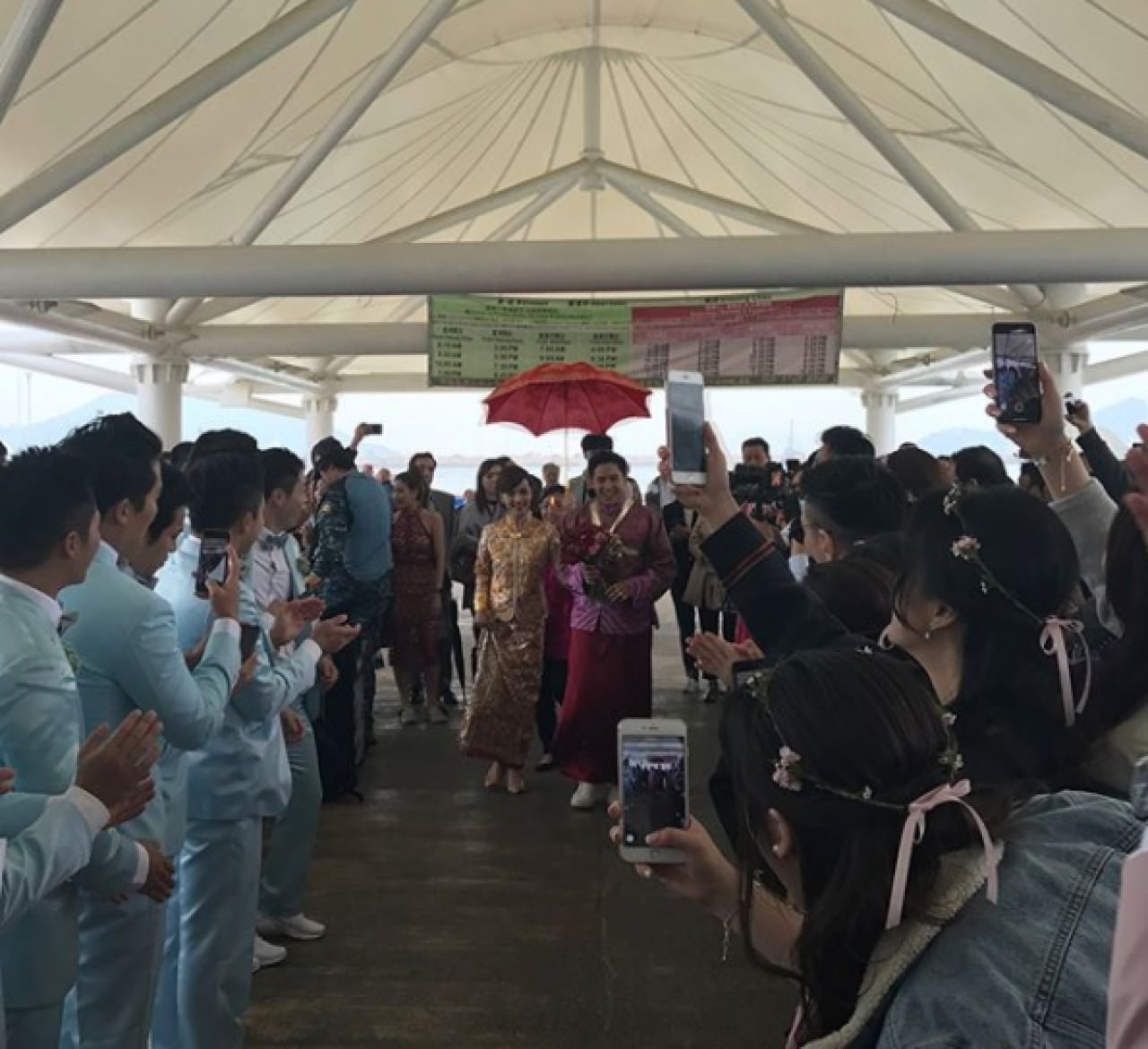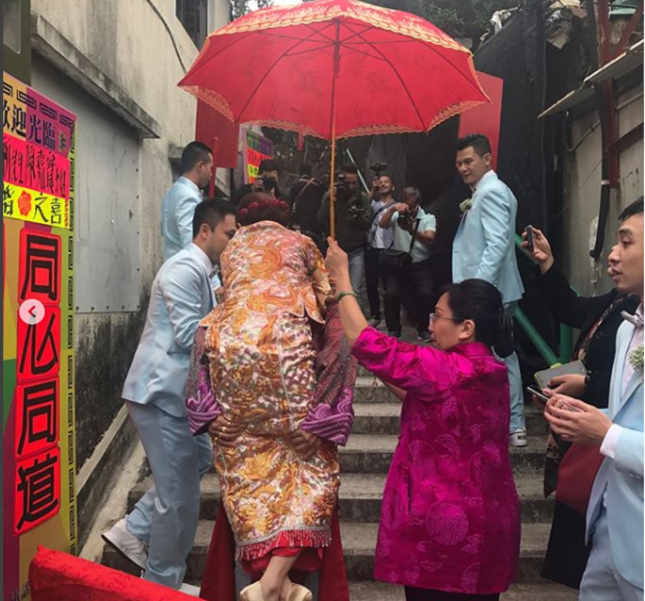 The couple followed traditional Chinese and Cheung Chau wedding customs. That morning, Epaphras and his groomsmen arrived at the InterContinental Hotel in Tsim Sha Tsui to fight for Anjaylia’s hand in marriage. Afterwards, Epaphras and Anjaylia went to the island of Cheung Chau, Epaphras’ ancestral hometown, by ferry. Following traditional Cheung Chau customs, Anjaylia was greeted by a large bridal sedan chair and Cheung Chau locals. Epaphras carried Anjaylia became home, officially entering the home of the Wong family.