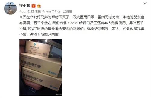 Still, the couple must’ve realized they didn’t do well enough, and Xiaofei immediately announced they also have face masks for Taiwan. He said on Weibo, “Today, I bought 10,000 masks with the help of my good brothers in Taipei. Although I don’t have a way to send it out, local friends also need it, so 5,000 are placed at our Taipei S Hotel for our employees and guests to use for free, and we asked our community leaders to donate the other 5,000 to our neighbors.”