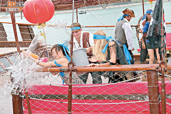 At a promotional event yesterday, Bosco Wong and Vivien Yeo (楊秀惠) dressed as pirates to and threw water bombs at each other while playing outrageously. Wearing a revealing top and a mini-skirt, Vivien battled the strong winds and while trying to tame her flyaway skirt, could not heed her top.