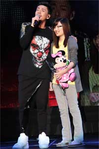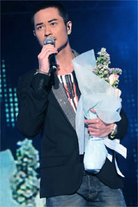 Always possessing a lively presence, Bosco had the most number of fans present. Fans traveled from Taiwan, mainland China, and Hong Kong to attend the concert. Bosco’s dancing skills were impressive and he danced effortlessly while singing, Hey Boy and 千金散尽. In addition, Bosco had good skills in chatting with fans. He laughed and said that for fans carrying signs with is name had benefits. He invited a female fan onstage and gave her a Mini Mouse stuffed animal and a bouquet of flowers. The female fan sang the song Loving You From All Angles <全角度爱你>.