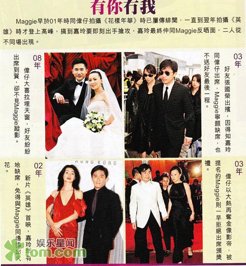 At Leslie Cheung Kwok Wing’s funeral in 2003, Maggie allegedly refused to attend after realizing that Carina and Tony would attend. In 2003, Tony received the Hong Kong Film Academy ’s Best Actor Award. Although Maggie was nominated for Best Actress, she did not attend the awards ceremony. Many of Tony’s friends were present at his wedding with Carina in Bhutan , but Maggie was noticeably absent.