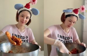 After going grocery shopping, Carina recorded herself making garlic grill pork ribs. She sat in one spot the whole time and strategically used a huge bowl to cover her stomach. Although her limbs were slim, netizens pointed out that the difference in her key facial features is obvious. They commented, “Is she pregnant? She looks quite chubby,” and “Her nose got bigger, so it’s likely she’s pregnant.”