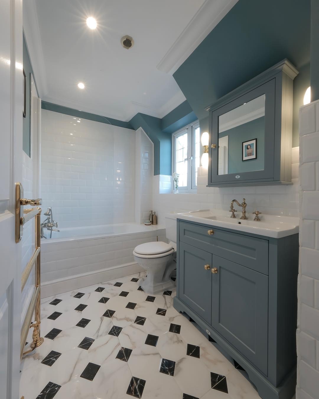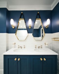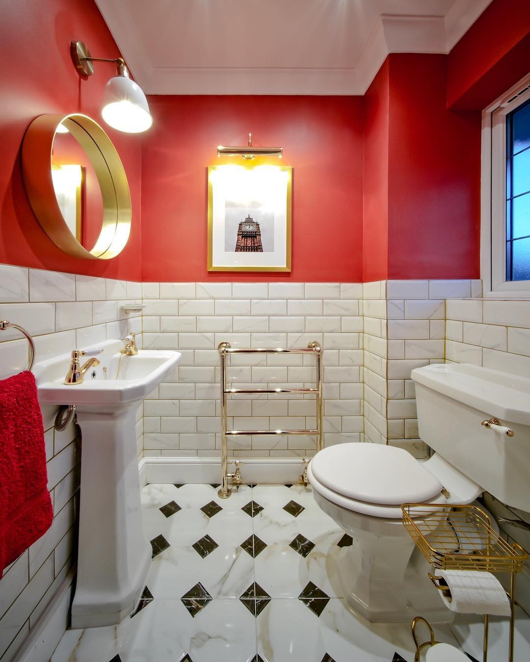Bright red colored paint took up the top half of the walls while marble brick patterned tiles covered the rest of the bottom. Retro gold elements shine glamorously in the room, and it also runs into the shower room that is painted in ocean blue.