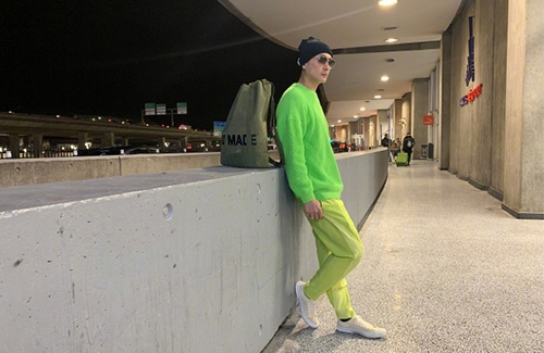 Bosco’s theme that week was neon and long coats. On his first night in Paris, Bosco wore a neon green crewneck and lime green trousers. At the Homme Plissé Issey Miyake fashion show, Bosco stuck with the neon theme and wore a neon pink suit, reminisce of a similar pink worn by Joel Chan (陳山聰) at the 2019 TVB Anniversary Awards. At the Paul Smith event, he had on a long coat with neon orange lining.