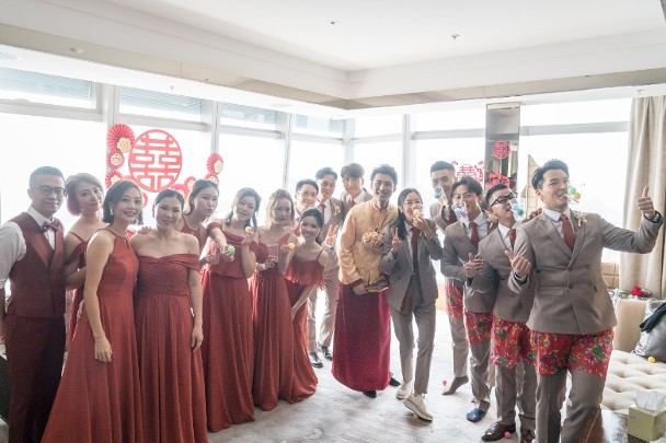 With many friends in the entertainment industry, Stephen’s groomsmen included Kenneth Ma (馬國明), Jazz Lam ( 林子善), Natalie Tong (唐詩詠), Jack Hui (許家傑), Chiu Hoi Yeung (楊潮凱), Eric Li (李天翔) and Calvin Chan (陳偉洪). The joyful party dressed in coordinated attires and was seen playing door games.