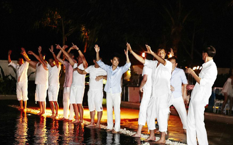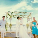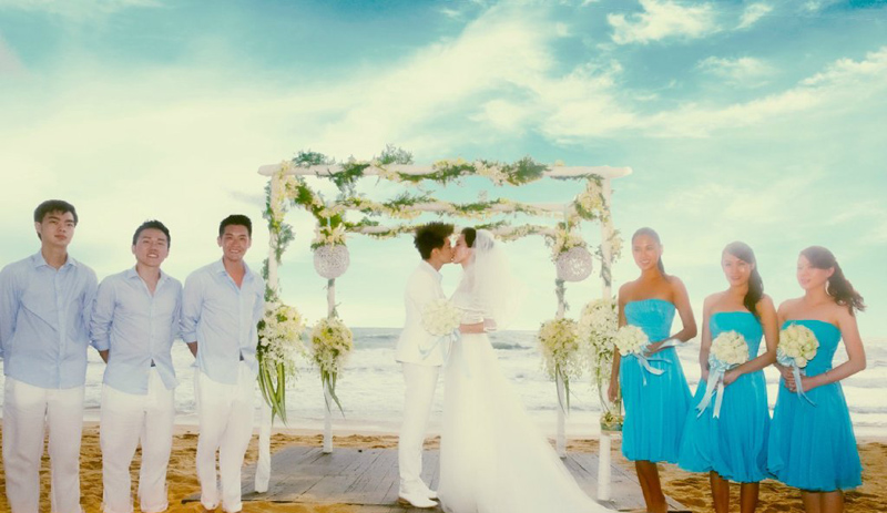 On July 30, 38-year-old Taiwanese singer/actor Jimmy Lin (林志穎) and his 28-year-old model girlfriend Kelly Chen (陳若儀) held their wedding reception in Thailand. Although the two registered their marriage in 2009 and already have a four-year-old son, they held out on the actual reception until this year. The wedding took place on a beach in Thailand, with fifty of their friends and relatives present to witness the joyous occasion.