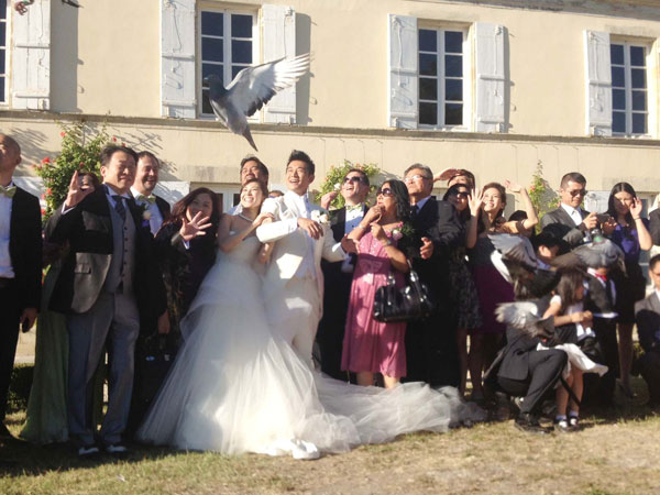 In order to prepare a memorable day for his bride, Stefan painstakingly spent half a year to plan the wedding in France. Both Stefan and Peggy looked picture perfect. Stefan was tucked in a milky white tuxedo with a pure white vest and a striped windsor tie. Peggy also took everyone’s breath away, as she glowed in an elegant tulle wedding dress with lengthy bridal veil.