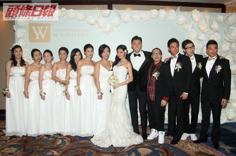 At Yoyo and Vincent’s wedding, the groomsmen included C-Kwan (C君), Him Law (羅仲謙), 6-Wing (陸永), Stephen Huynh (黃長興), Edwin Siu (蕭正楠), and Nancy Wu (胡定欣), who acted as a “brother.” Yoyo’s bridesmaids were her friends outside of the entertainment industry.