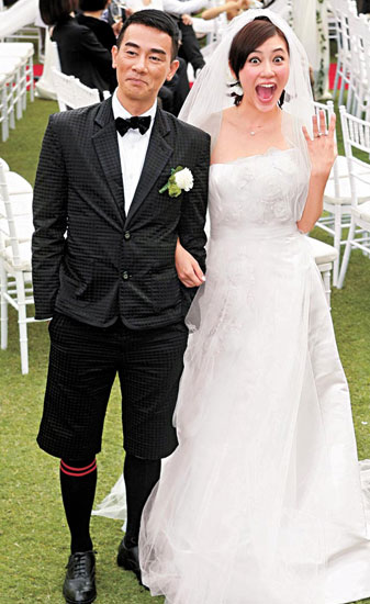 After the wedding, Cherie said, “Jordan and I got married earlier in the year in Las Vegas . We decided to have another wedding ceremony and banquet in Hong Kong due to Jordan ’s father [who has mobility issues and could not travel to the USA ]. We asked Louis Yuen to host our wedding ceremony. Today, Jordan ’s father was so moved, he cried tears of happiness. Disneyland is a magical setting. The views of the sea and grass make it very romantic. We are just like a prince and princess! Unfortunately, my idol, Andy Lau Tak Wah, could not attend our wedding due to his work schedule in Taiwan .” Jordan added, “Although we had over fifty tables in our wedding banquet, we could not invite all of our friends. I hope I did not offend anyone.”