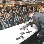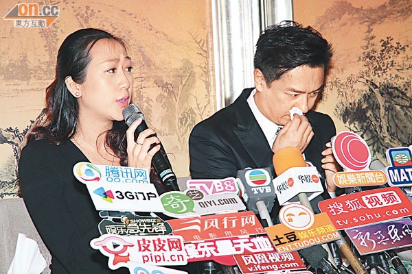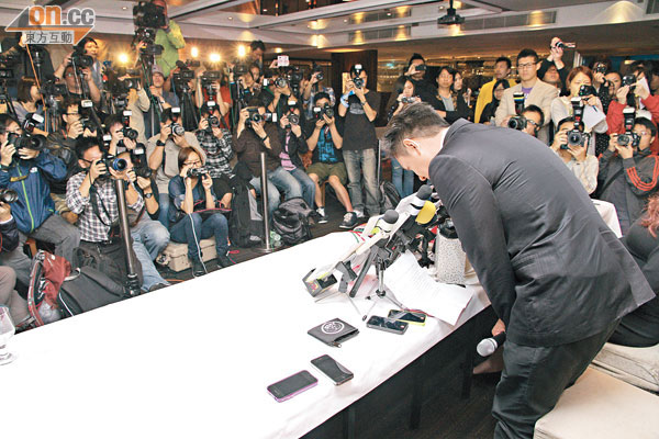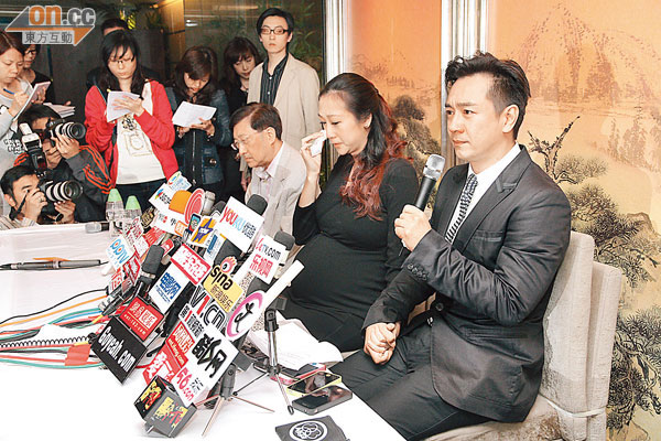 At 4 PM, Benny Chan was accompanied by his 10-month pregnant wife, Lisa Chiang, and his manager, Charlie Lam (林查理), at the press conference. Wearing a black suit, Benny appeared distressed. He helped his wife get situated before attempting to regain his good husband image. After his manager addressed the audience, the downcast Benny took out his notes for the speech. Holding Lisa’s hand, Benny stated his repentance, “Regarding the unpleasant incident which occurred with Rose Chan last week in Hengdian, I sincerely apologize.” Taking a deep breath, Benny said, “I am sorry,” and stood up to make a deep bow.