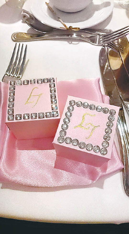 The venue was decorated simply in white and pink, with roses and orchids. Linda and Jeremy’s wedding photos were on display, allowing the guests to enjoy them. The party favors were packaged in pink boxes, in which Linda personally glued the crystal decorations on the box tops.