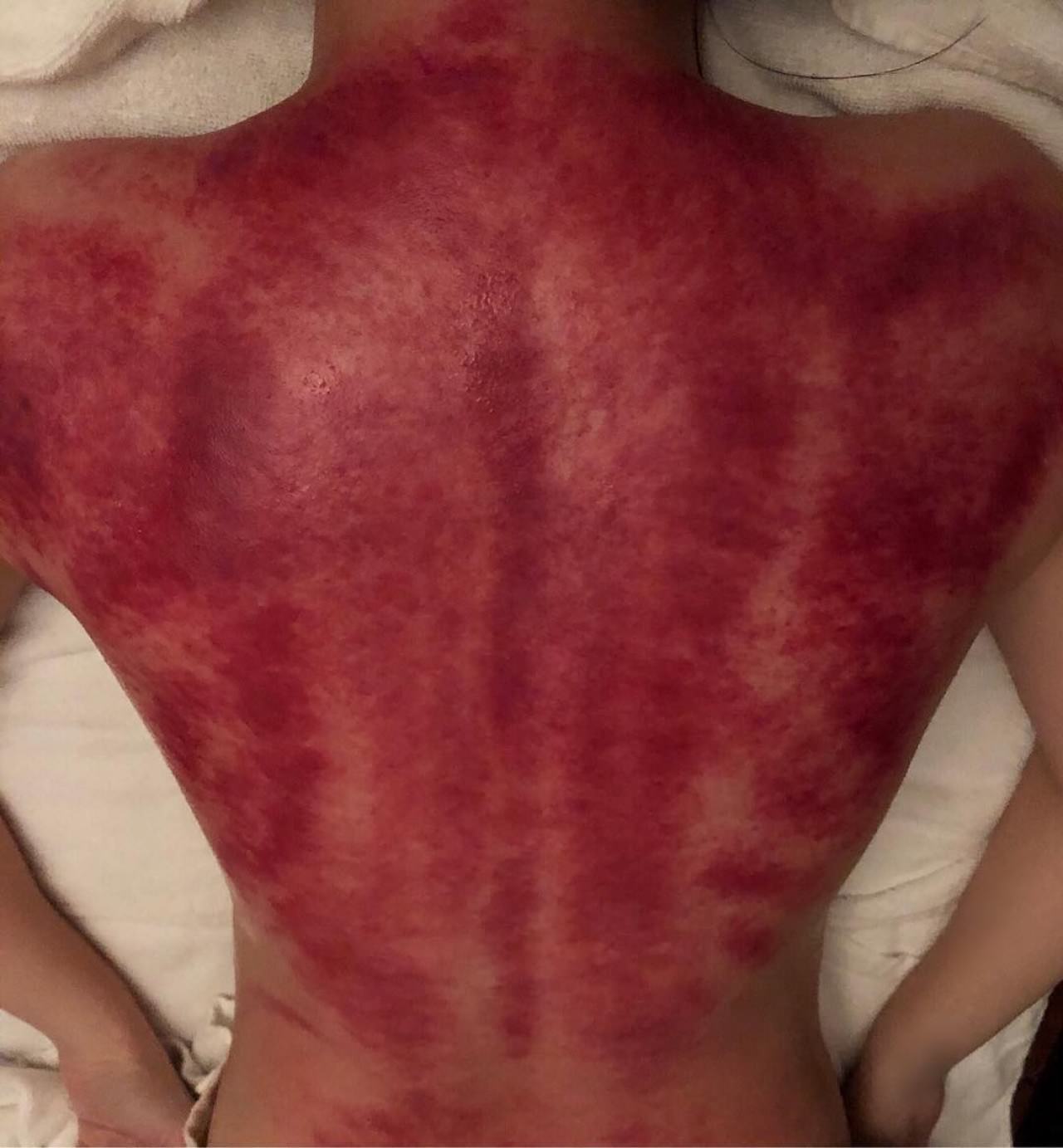 Nothing to worry about. Gua sha does produce this effect, although hers is a bit on the extreme side. Like the TCM doctor said, maybe the procedure went on too long.