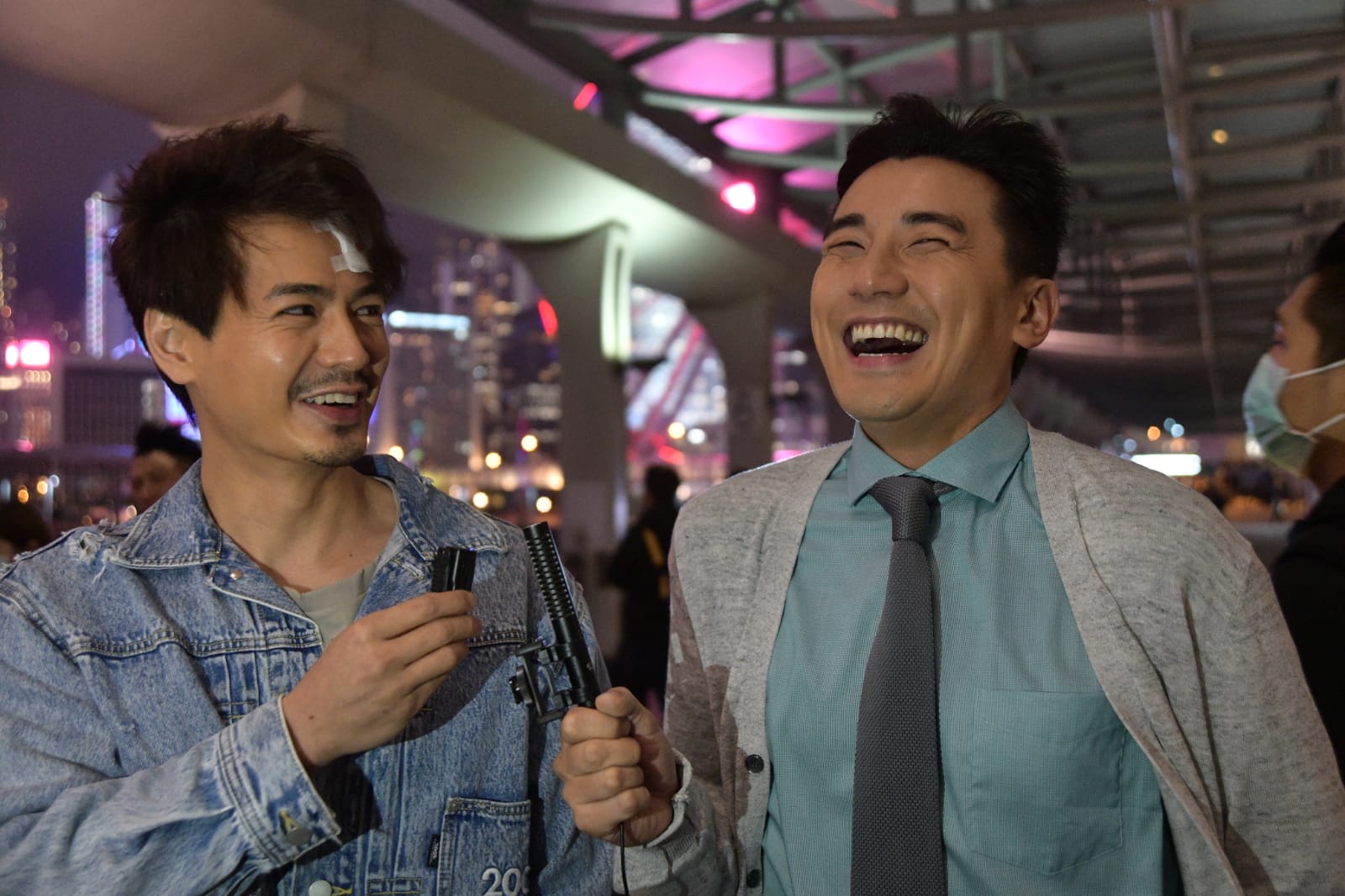 Actors Tong Hung (洪永城) and Him Law (羅仲謙) were involved in filming a negotiation scene for Armed Reaction 2020 <陀槍師姐2020>. Tony expressed how he was influenced by Him’s joyous mood of becoming a dad soon and having a happy family. Asked if he would hasten progress with his girlfriend Inze Leong (梁諾妍), Tony said he would definitely share any good news publicly.