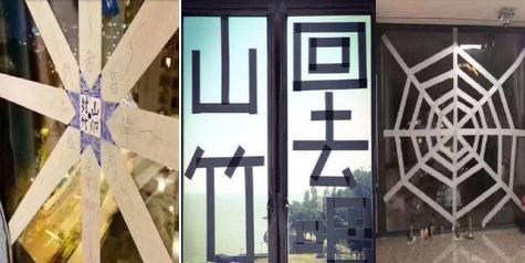 Some netizens shared taping pictures of their own. One netizen taped a spider web on the glass, while another taped the words, “Mangkhut just go home.”