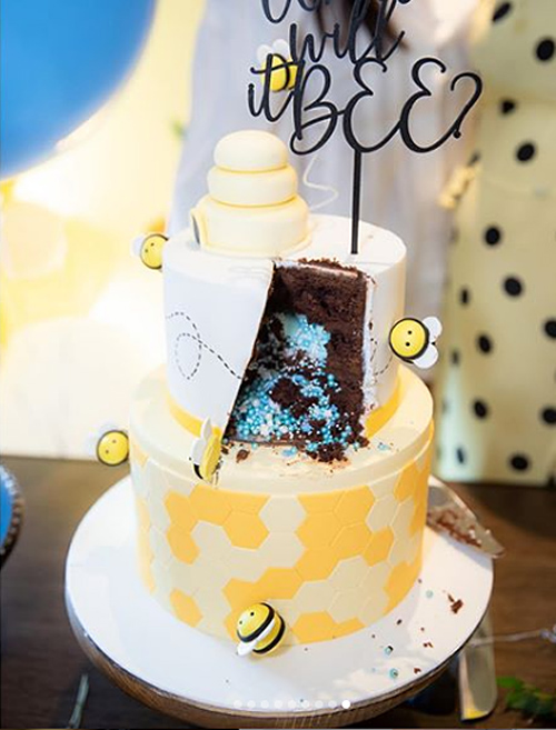 The party was held today and featured a clever tag line, “Ba-Bee shower, What will it be(e)?” that matched the bee-themed party and kept their friends guessing the baby’s gender. Finally, the big moment came when Grace would reveal the baby’s gender by cutting the cake, in which the color would tell their friends whether she is carrying a boy or girl.