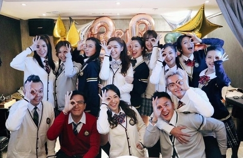 With her 30th birthday being tomorrow, Jacqueline Wong (黃心穎) has been basking in celebrations since a few days ago. Yesterday, her close-knit friends from the entertainment industry threw her a lively party with everyone dressed in school uniforms, including the birthday girl’s boyfriend, Kenneth Ma (馬國明). However, his red sweater, glasses, neatly parted hair, and naturally confused expression made him look more like a principal than a student!