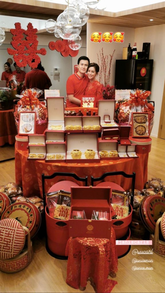 Janice and Carl were surrounded by traditional Chinese wedding decorations and gifts. There were many boxes of dried seafood and Chinese delicacies. At least 10 pairs of dragon and phoenix bracelets were gifted to the bride, and the gold jewelry featured the popular “pig” motif to wish Janice luck in bearing many children.