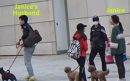 Recently seen walking her dog with friends at the Cyberport Waterfront Park, Janice and her friends did not seem worried and did not wear surgical masks. Instead, she was seen with a portable air purifier around her neck. The group stayed until early evening. Her husband, Carl, was seen carrying their dog and heavy bags whereas Janice was talking with her friends and walking slowly back towards the car. It seems that Carl really dotes on Janice and treats her like a queen!