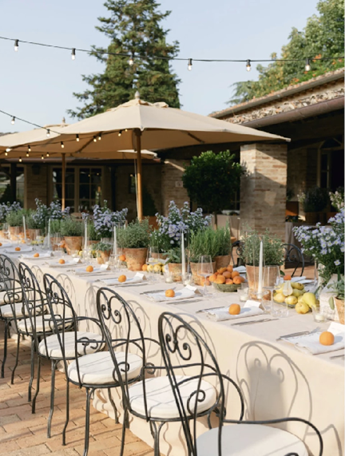 The 30-year-old wore a sweet pink long dress with a deep V neckline, while Brian donned a stylish white suit. The couple walked hand in hand into the venue, followed by a three-person band, creating simple yet grand vibes. They decided to hold the wedding banquet outdoors, with long tables and round tables adorned with tall candles, exuding an Italian vibe.