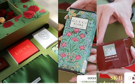 The bottommost layer of the box were various luxury skincare and daily use essentials including SK-II anti-ageing cream, silk eye masks, floral fragrances from Gucci, along with a celebratory bridal photo of the couple – all branded personal favorites of the bride-to-be Karena, specially curated by her to share the marital joy and pamper their esteemed guests.