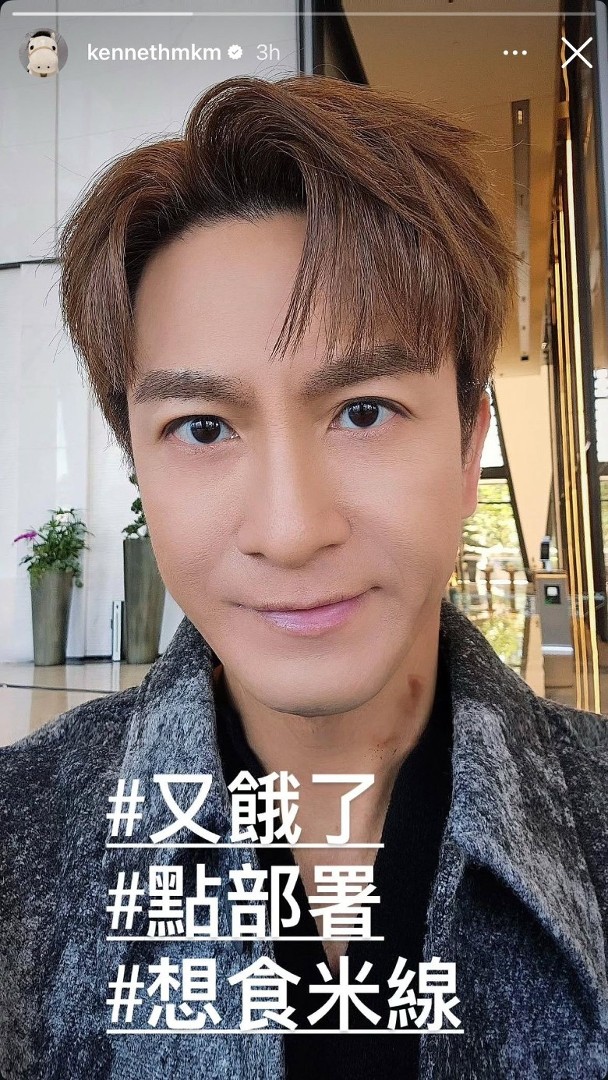Kenneth, who has been busy filming Queen of News 2 <新聞女王2>, posted a handsome selfie with the hashtags, “#I’m hungry again, #What’s the plan, and #I want to eat rice noodles.” His new light brown hair made him appear extra youthful.