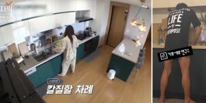 In the image, a man is seen with his back to the camera, wearing a T-shirt, but it appears that he is not wearing pants on his lower body. Suspected to be Kim Soo Hyun, his muscular legs are visible, with his private area blocked by captions. Some netizens noticed that the green kitchen counter in the image matches the one shown in 2020 reality show On & Off, where Kim Sae Ron revealed her home kitchen.