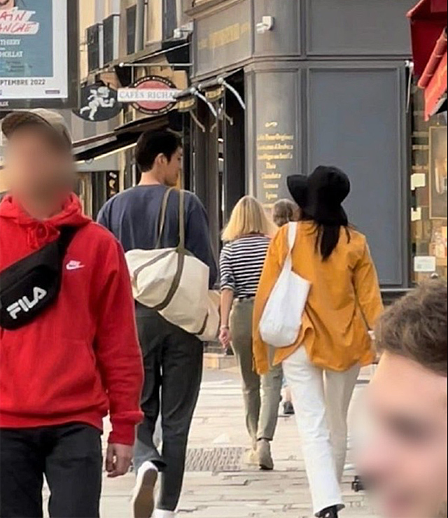 A fan posted snapshots of the couple at a coffee shop in the Marais district of Paris. Shin Min Ah was wearing a mustard yellow cardigan and discreetly hid her face beneath a black bucket hat. Kim Woo Bin was much less cautious about being recognized. When the couple realized they were being photographed, they graciously approached the fan and said hello prior to leaving.