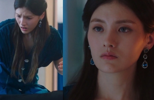 Although she wore this outfit briefly for a short scene, it still left a deep impression on viewers. She paired a royal blue dress with the same color gemstone earrings to present a dreamy and hypnotizing look. The striking color also matched her blue-grey colored contact lenses, which made everything look very cohesive.