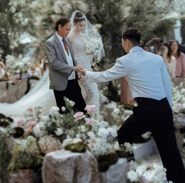 The wedding ceremony and reception was held in a glass building filled with lush greenery and big trees. It created a picturesque greenhouse coupled with white and pink flowers, brilliant sun, and blue sea. The most unique feature was the small bridge that was built over the pool, implying that the couple is walking towards a bright future. The lotus flowers in the pool were meant to symbolize Laurinda. After exchanging rings, Shawn vowed, “I hope to turn Laurinda from a confident, independent queen into a princess whom I will love and protect.”