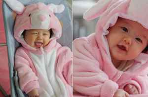 Only three months old, Anika Linda is irresistibly adorable in a pink bunny suit!