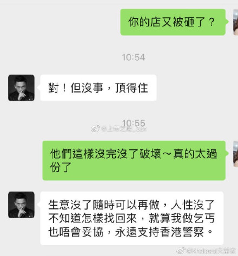 He said, “When you lose your business you can always start over again. When you lose your human nature I don’t know how you’ll find that again. Even if I starve I will not compromise. I will always support the Hong Kong police.”