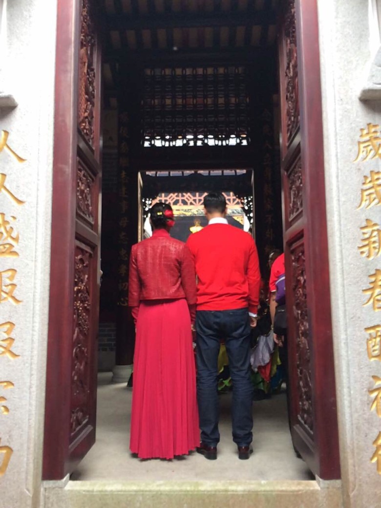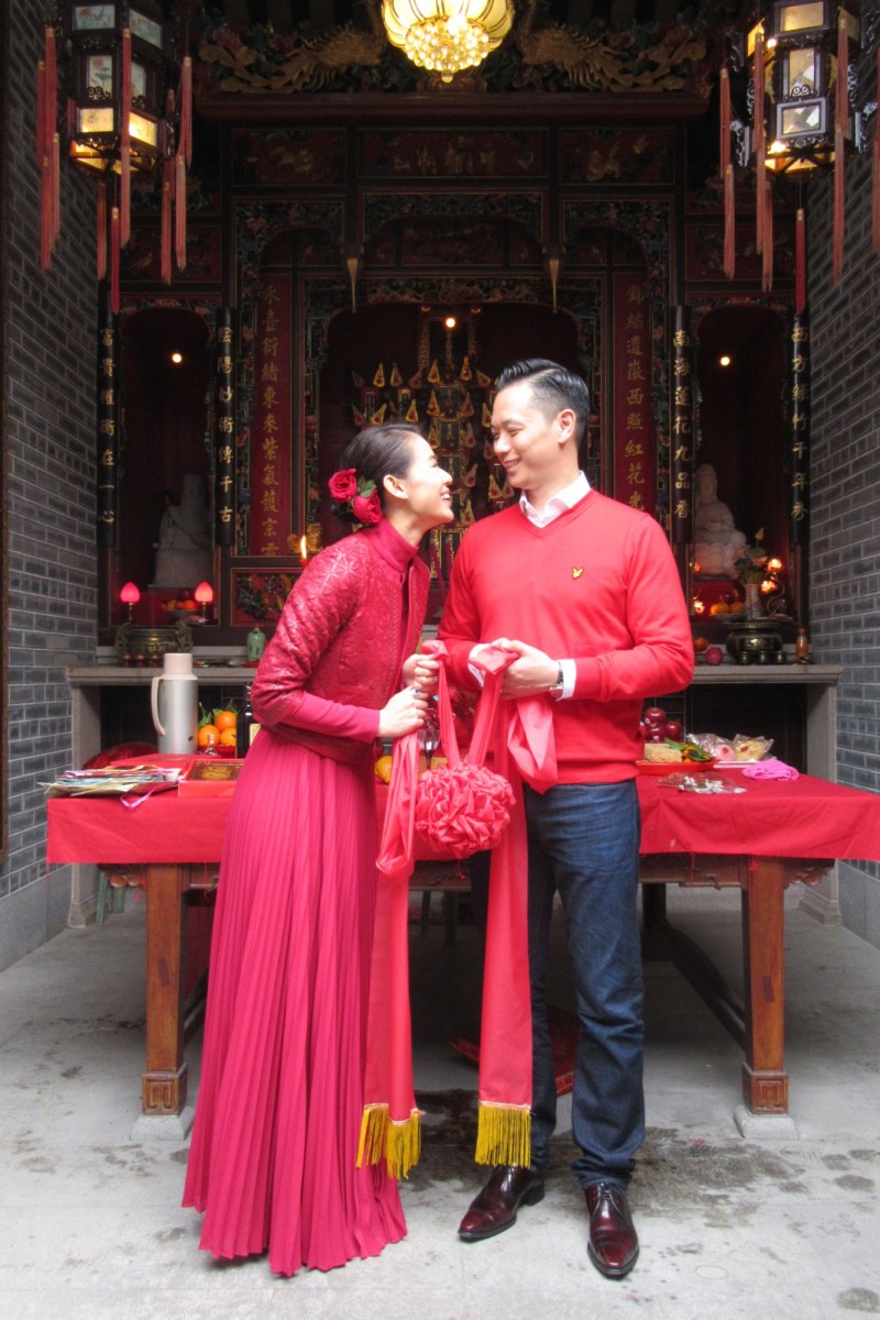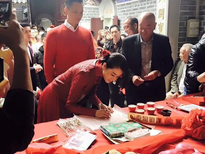 On the morning of January 2, Philip and Myolie paid an official visit to Philip’s Hakka ancestral village of Sheung Wo Hang, where they worshiped the Lee family’s ancestral shrine, as per Hakka tradition for newlywed couples. Myolie was dressed in a long red dress, while Philip had on a red pullover.