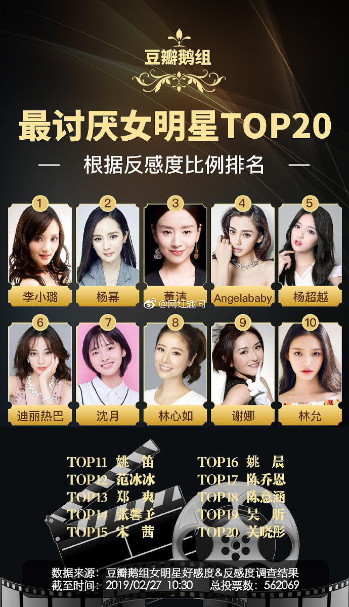 With the mega success of Chinese dramas and variety programs in recent years, the industry’s unstoppable growth has helped shape a mass culture of celebrity worship and star-chasing. However, with popularity also comes criticism. A community Chinese online platform Douban, known for celebrity gossip and spilling secrets, recently conducted a survey asking fans to vote for their “Top 20 Most Detestable Female Stars”, evoking much public discussion.