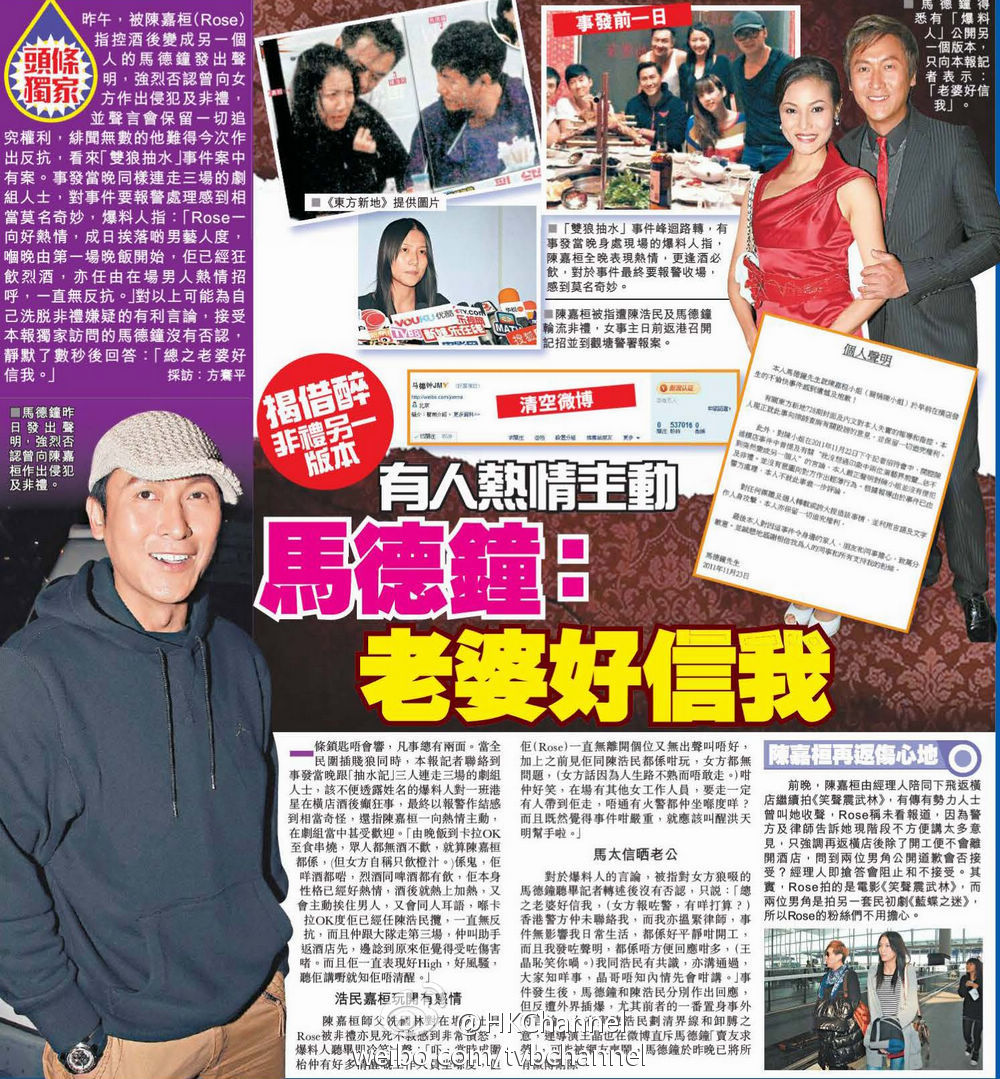 After the Apple Daily reporter repeated the crew member’s account of the incident, Joe Ma did not deny the details. Joe only stated, “Anyhow, my wife trusts me very much.” (Rose filed a police report in Hong Kong; what do you plan to do?) “The Hong Kong Police has not contacted me yet. I am currently looking for a lawyer. The incident did not affect my daily routine; I am going to work peacefully. Since I already released a press statement, I am not in the position to respond too much over the matter.” (Director Wong Jing 王晶 ridiculed you.) “I have an understanding with Benny Chan and we have been in communication with each other. We know what is going on, but Jing Gor spoke in this manner because he did know the inside story.”
