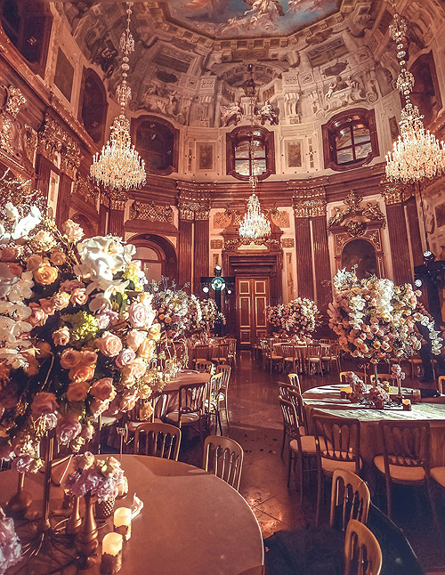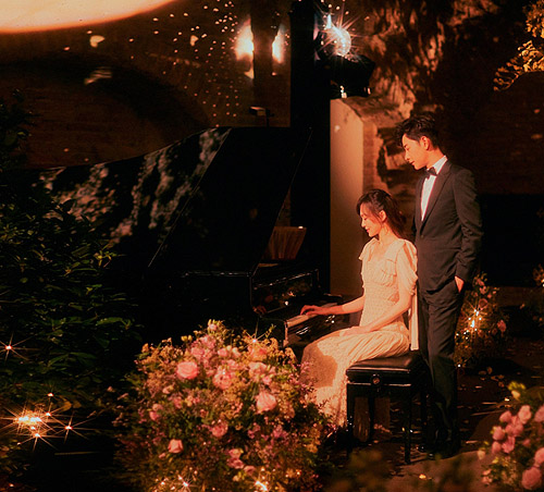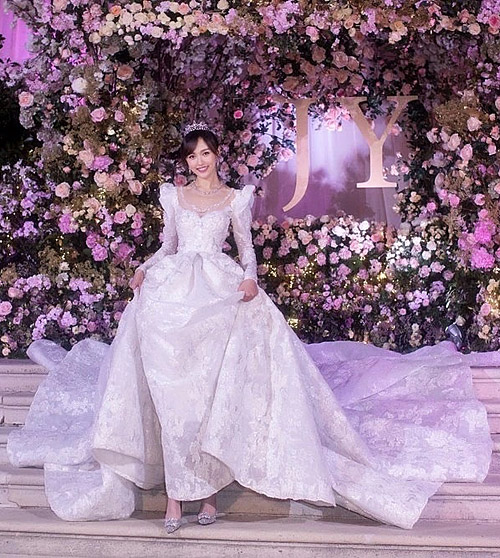 More photos of Tiffany Tang (唐嫣) and Luo Jin’s (羅晉) October 28th wedding were released today. The Schloss Belvedere museum in Vienna, Austria was a perfect venue for the couple, who wanted a romantic destination wedding. The venue was decorated with an abundance of silk flowers, giving the illusion of a rose garden.