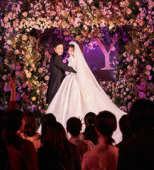 Tiffany’s long-sleeved wedding gown was designed by Mikael D, who also dressed Hannah Quinlivan (昆凌) on her wedding day.