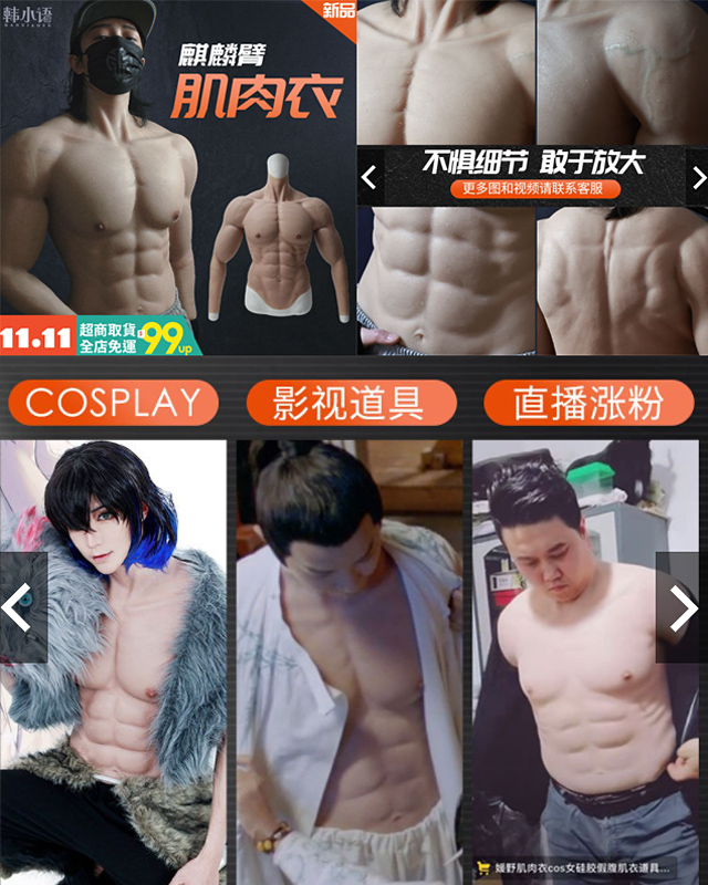 In The Blue Whisper, Jialun is suspected to have worn muscle shapewear which is sold online. There are many different styles to choose from to match different skin tones. Turning anyone into buff shape without sweating it out at the gym, the 3D muscle suit is popular for social media posts and cosplay purposes. The price ranges from 30 to 900 Chinese yuan.