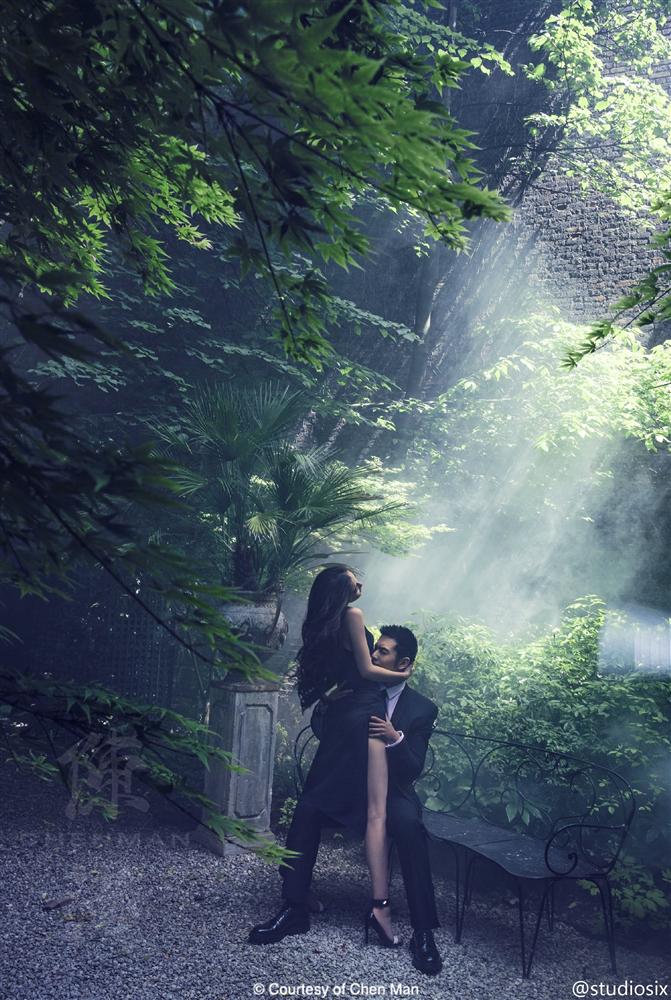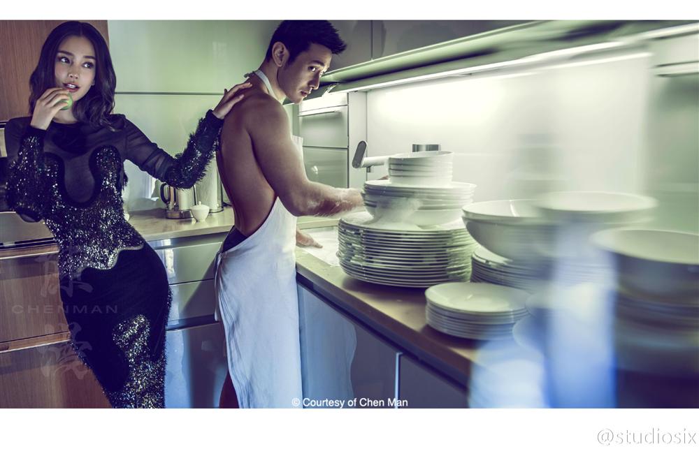In the new photos revealed last week, Xiaoming and Angelababy took on risqué shades, and donned much darker, sexier outfits. One photo has the couple lying under a drawing of a naked woman. Another photo features Angelababy taking on a dominatrix role while Xiaoming wore nothing else but an apron—perhaps they’re going for the naked apron trope?