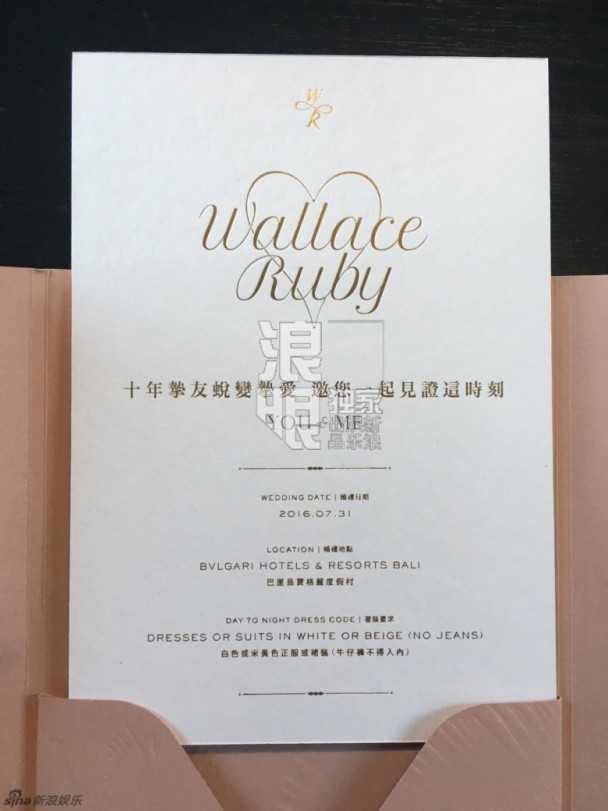 In gold lettering, the card said the wedding will take place on July 31, 2016 at the Bulgari Hotels & Resort Bali. The card also specified a “day to night” dress code, in which guests are required to wear dresses or suits in white or beige. Jeans will not be acceptable.