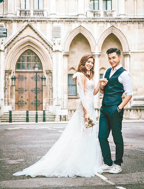 In one of their wedding photos, Ruco knelt on one knee to re-enact his proposal. The couple’s wedding photos were taken in London and Paris last month.