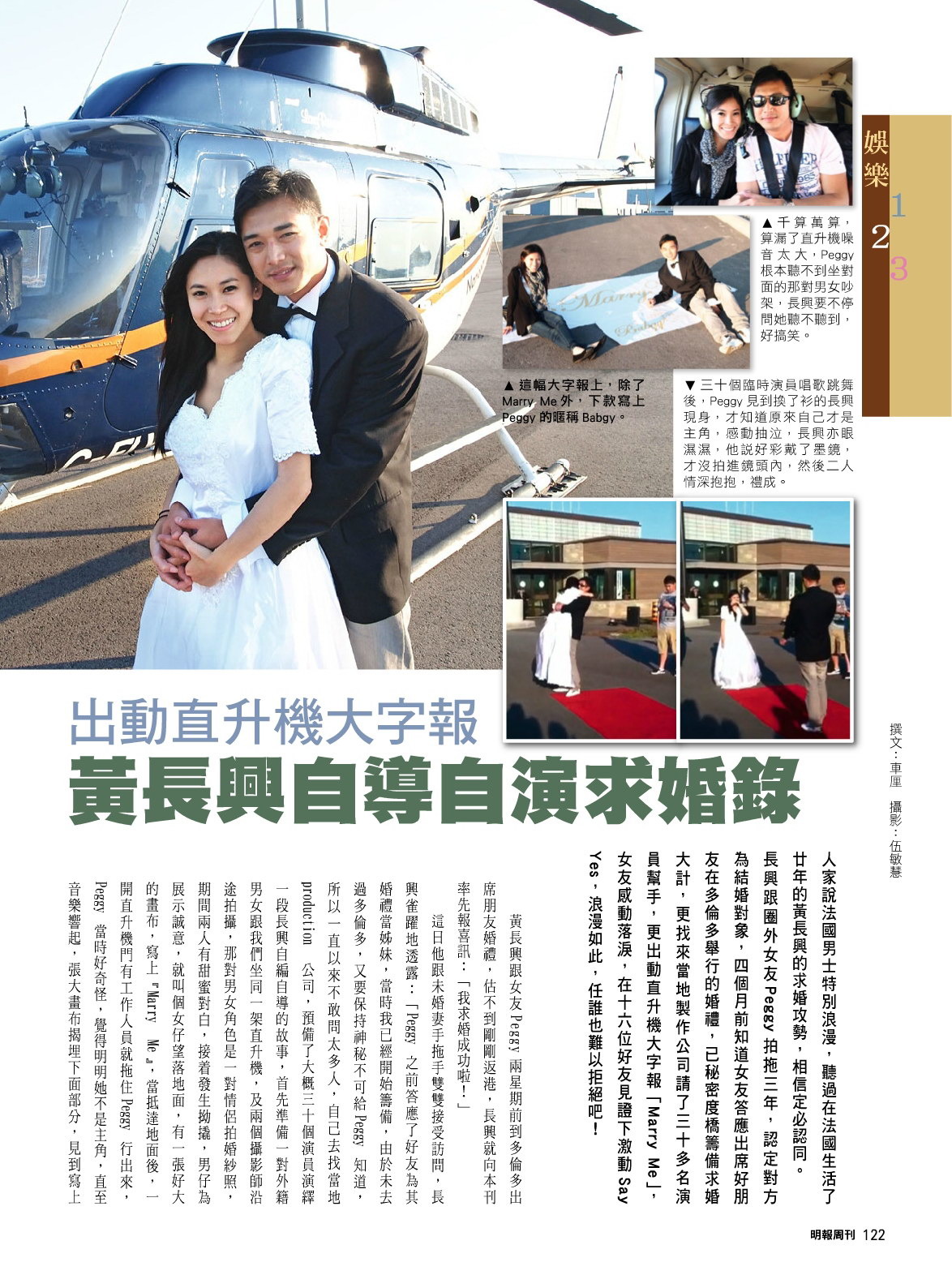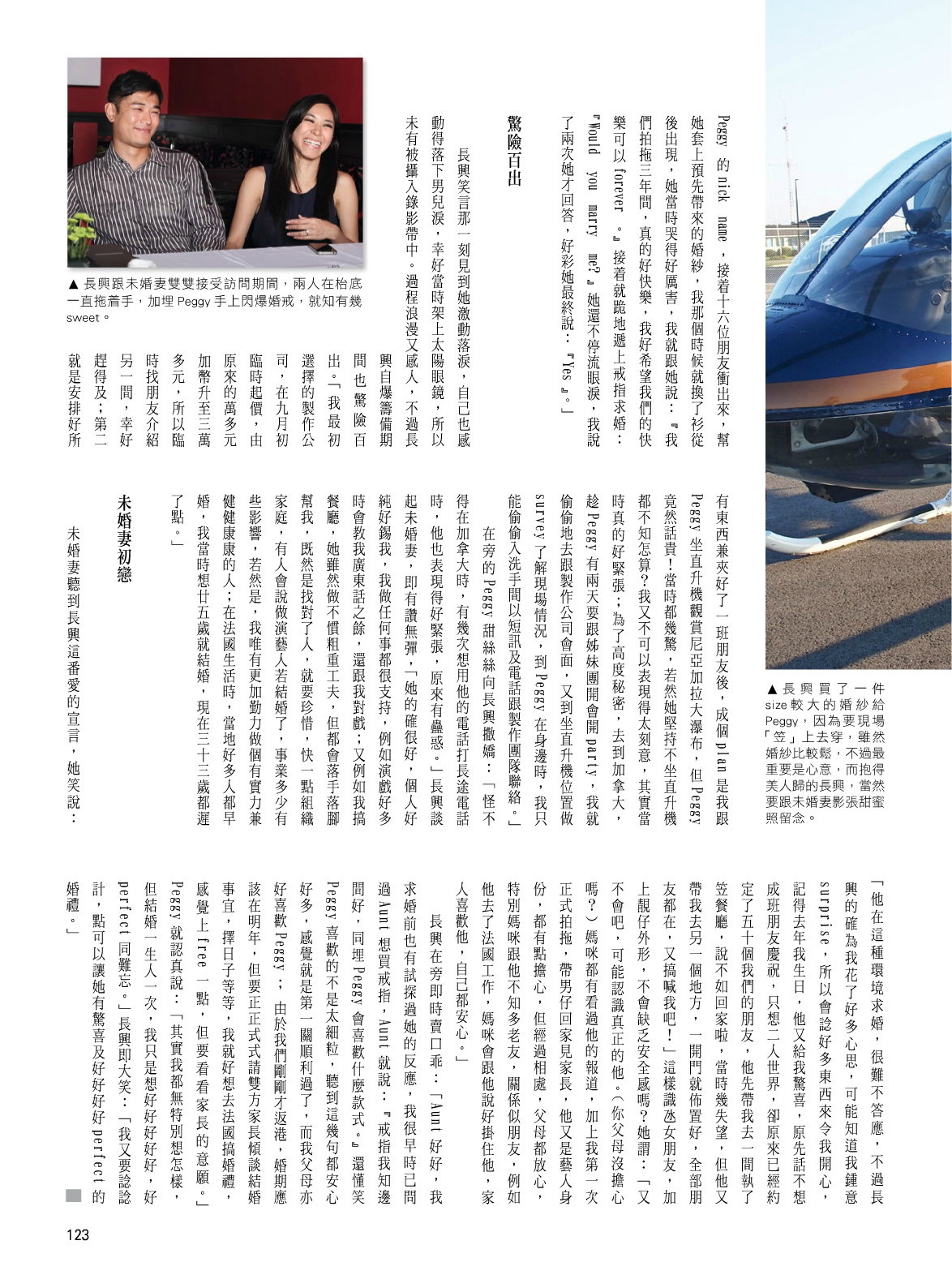 “Sixteen of our friends rushed forward and helped Peggy put on a prepared bridal gown, upon which I also changed into a suit and appeared. Peggy was crying uncontrollably when I said, ‘During our dating period of three years, I have experienced true happiness. I sincerely hope that our happiness will last forever!’ I knelt on the ground and took out the diamond ring, ‘Would you marry me?’ Peggy continued to cry and I had to ask twice before she said, ‘Yes.’” Stephen laughed and revealed that when he saw Peggy crying, he also shed a few tears. Fortunately, Stephen was wearing sunglasses at the time and his tears were not captured on camera.