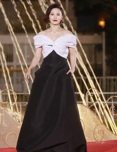 Alice Chan had two looks: a navy “swimsuit” dress with sheer skirt, and more elegant white “nude” bridal dress, both designed by Dorian Ho. Accessorizing with $5 million HKD in diamond jewelry and shoes by Rene Caovilla, Alice delivered one of the more memorable looks tonight.